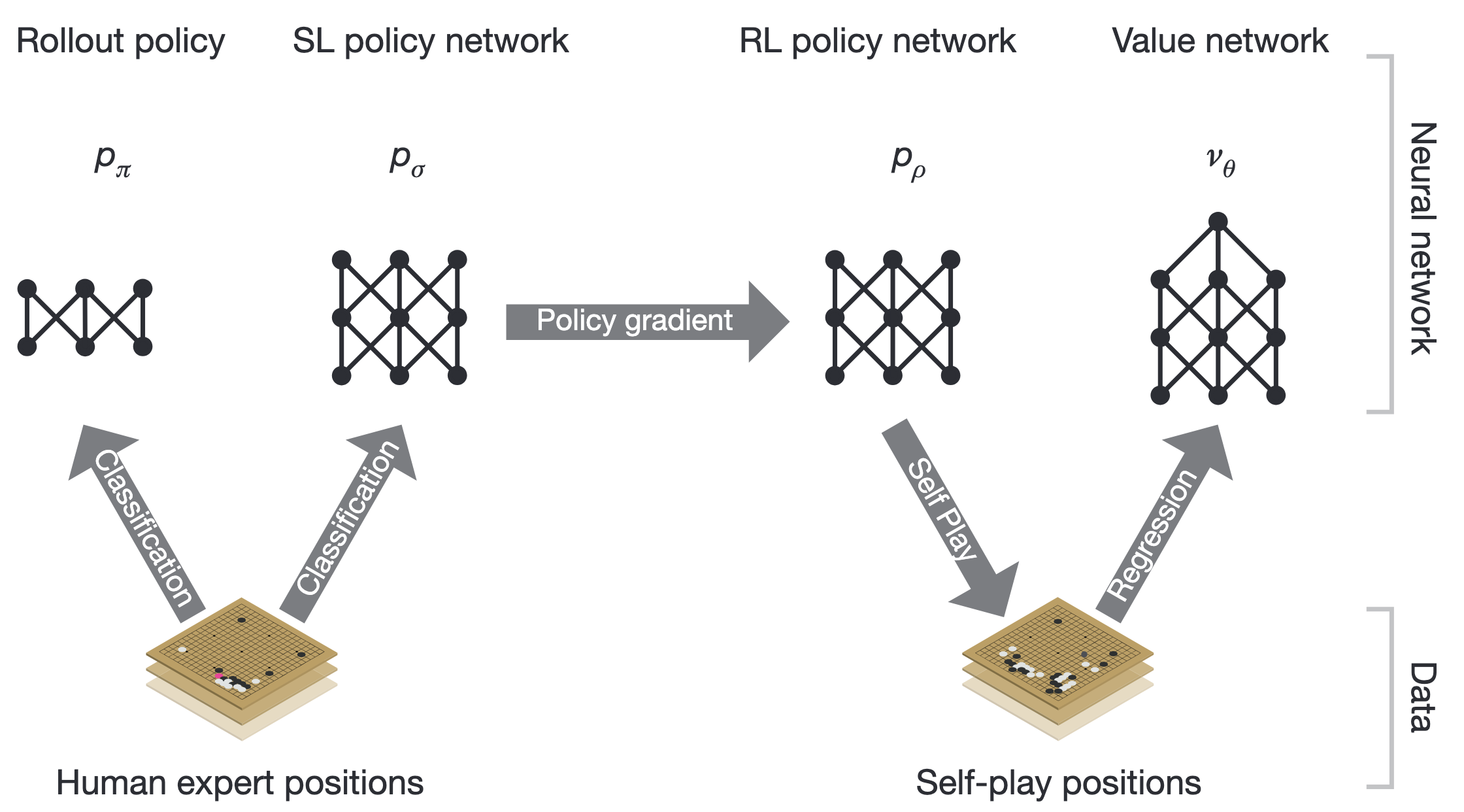 AlphaGo training pipeline starting with supervised learning on expert games and then reinforcement learning from self-play. Cf. Silver et al. (2016).