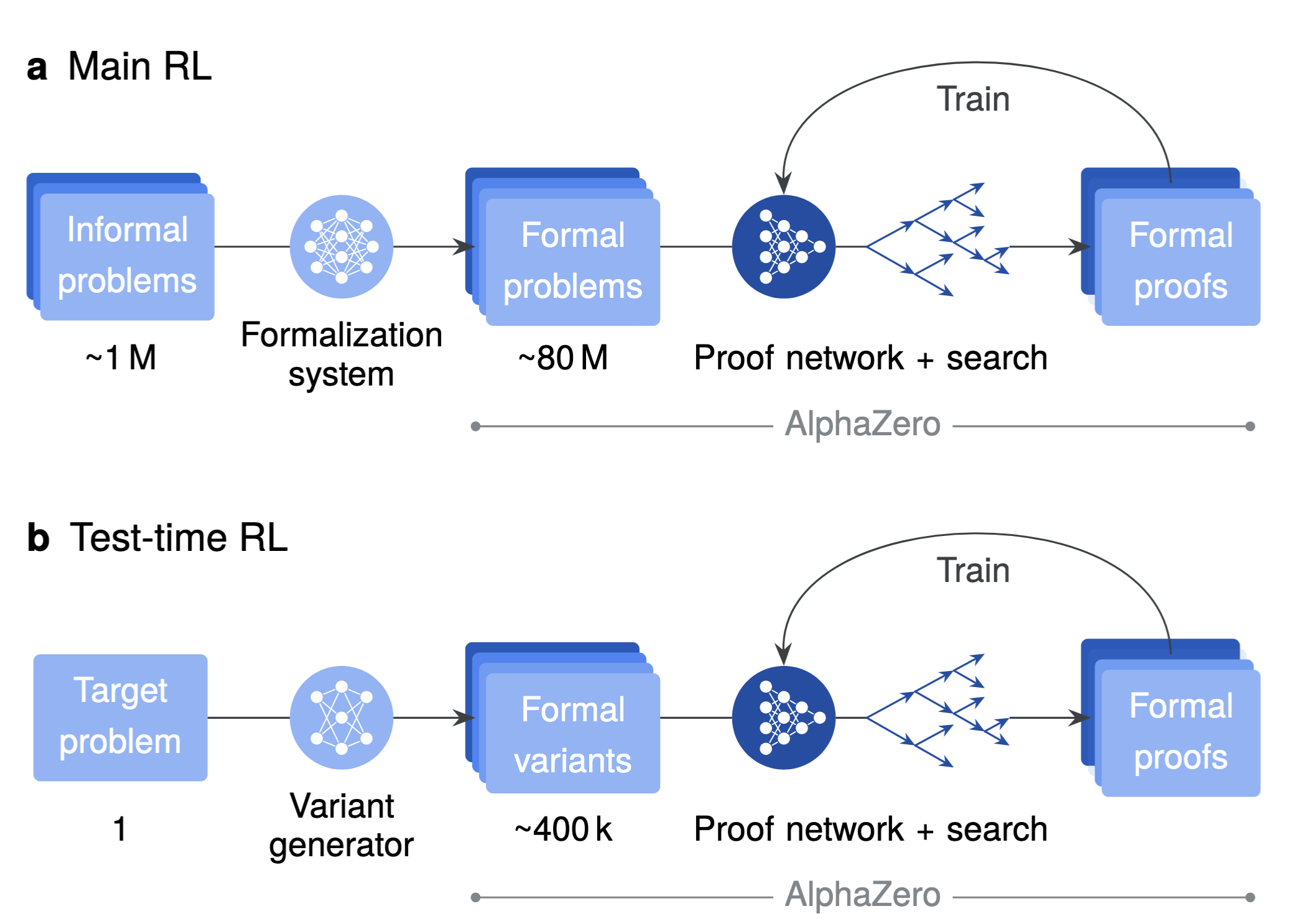AlphaProof training and adaptation pipeline: (a) main RL over a large auto-formalized corpus, and (b) test-time RL on generated variants of a target problem. Cf. Google DeepMind (2025).