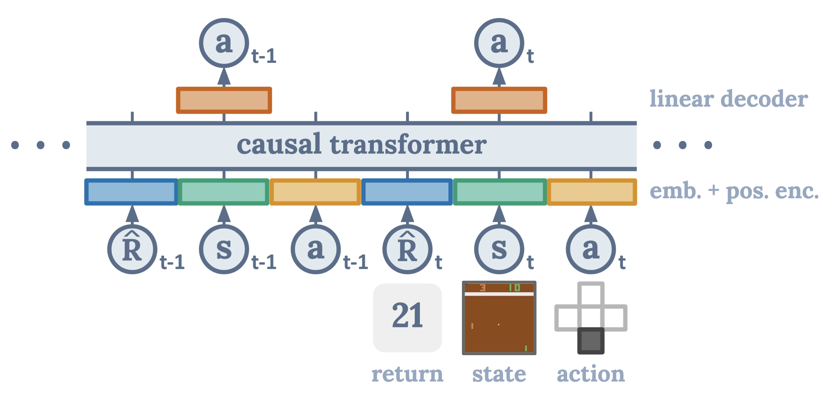 Decision Transformer: a causal transformer conditioned on desired return , states , and actions ; it predicts actions via a linear decoder. Cf. Chen et al. (2021).