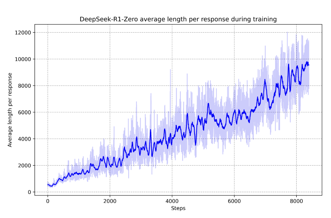 DeepSeek-R1-Zero average response length during RL training (adapted from Fig. 1b in DeepSeek AI (2025)). The steady growth in tokens reflects increasing test-time computation and richer internal deliberation as training progresses.