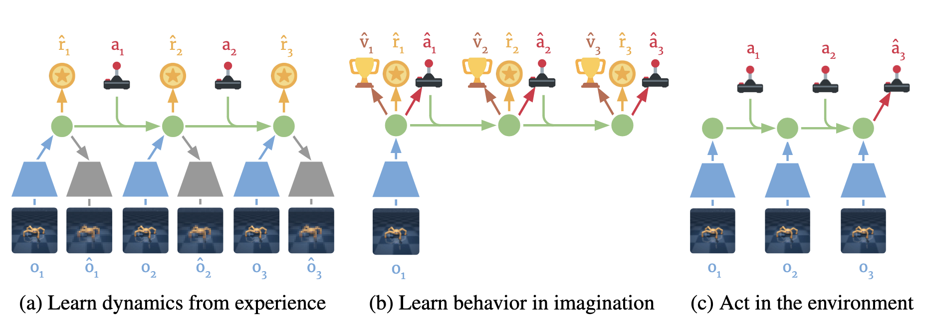 Components of Dreamer. (a) From the dataset of past experience, the agent learns to encode observations and actions into compact latent states and predicts environment rewards. (b) In the compact latent space, Dreamer predicts state values and actions that maximize future value predictions by propagating gradients back through imagined trajectories. (c) The agent encodes the history of the episode to compute the current model state and predict the next action to execute in the environment. Cf. Hafner et al. (2020).