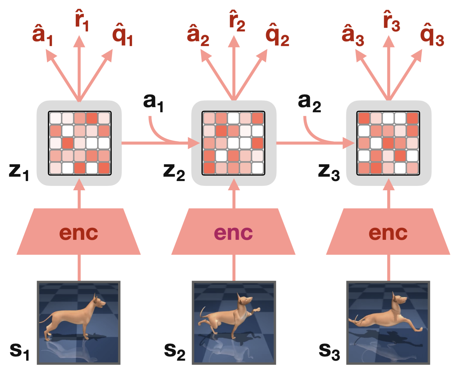 TD-MPC2 recurrent architecture: observations are encoded into latent states ; actions drive transitions in latent space; from each the model predicts action , reward , and Q-value . Cf. Hansen et al. (2024)